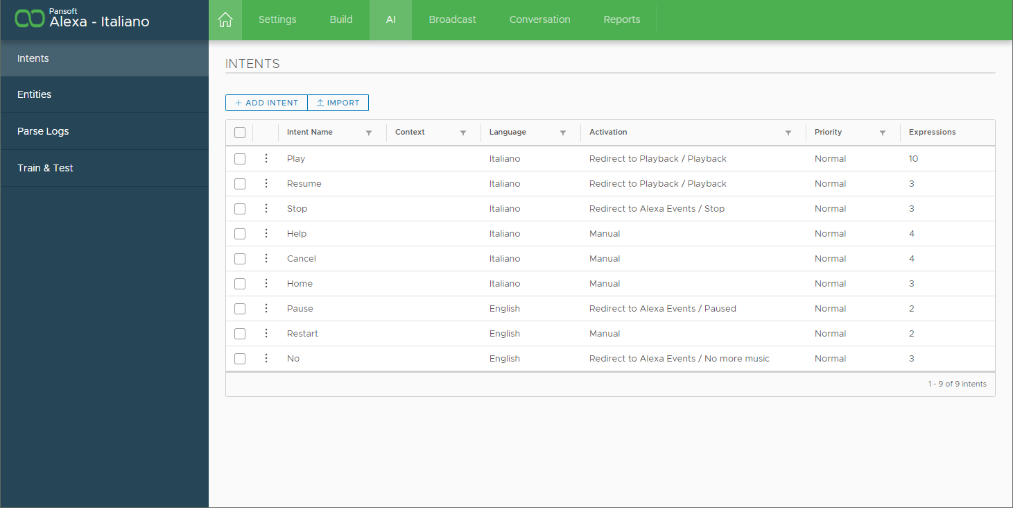 Inside the Xenioo AI section, we will define all the intents and expressions that will be used to create our Skill model and to define how the flow of the conversation will execute.